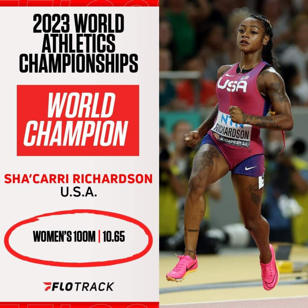 Sha’Carri Richardson runs a championship record 10.65 to win the women’s 100m world title at the #WorldAthleticsChamps!
