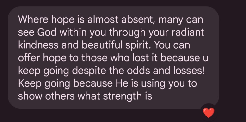 You told me you admired my calling to serve other people but, to not set myself on fire to keep other people warm. You gave me your strength, many times when you had none for yourself.