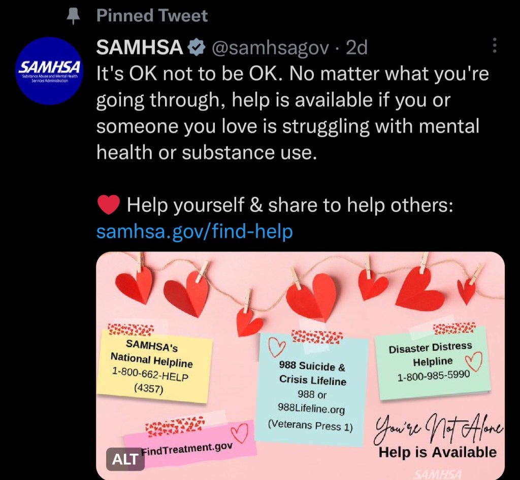 Happy Valentine’s Day ♥️ February 14, 2023February 14, 2023Leave a comment ♥️ 988 Suicide & Crisis Lifeline ♥️ https://www.samhsa.gov/find-treatment