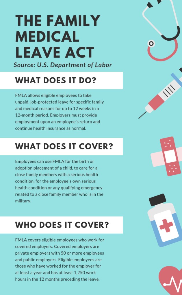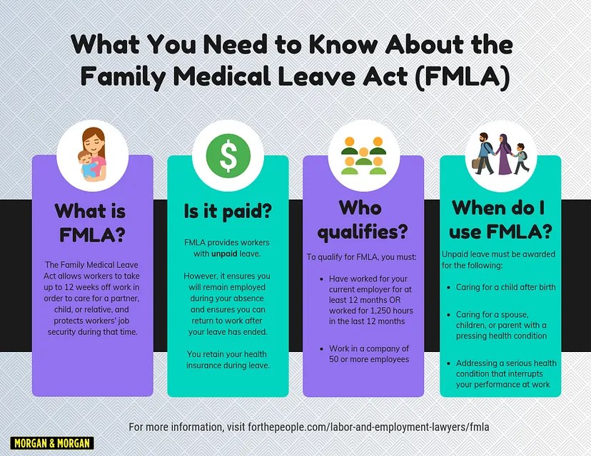 The Family and Medical Leave Act (FMLA) is a federal law that gives eligible employees up to 12 weeks of unpaid leave per year for certain family and medical reasons. The FMLA also requires that employees’ group health benefits be maintained during their leave.
